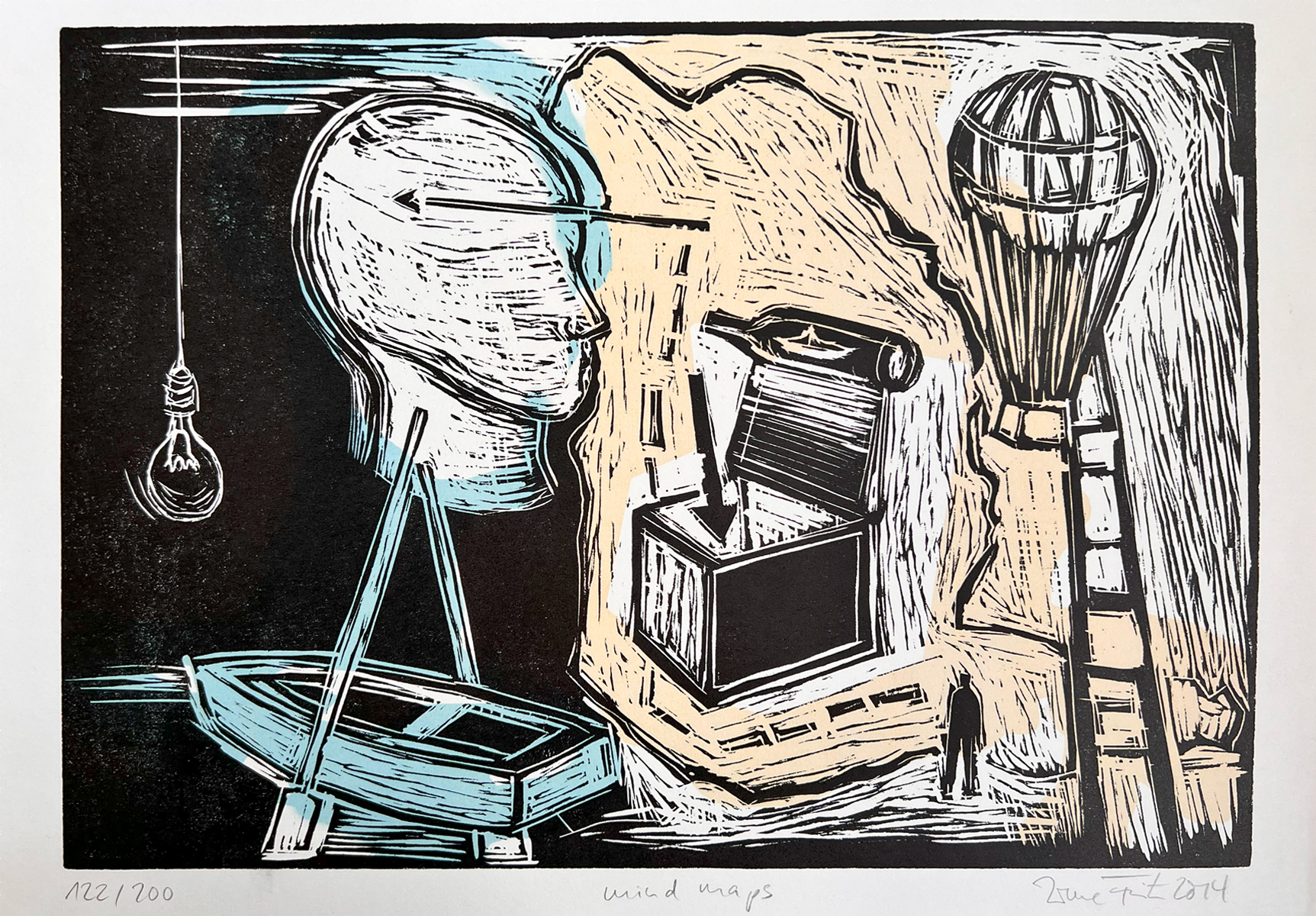 Das Boot ist ein archtypisches Symbol und steht für den Übergang, das Unterwegssein, für die Reise. Jede Art von Karte, sei es zu Wasser, zu Land oder in der Luft, übt für mich von jeher eine große Fazination aus. Sie drückt wohl eine generelle Sehnsucht nach einem jeweils anderen, vielleicht idealem Ort aus, den man gleichwohl niemals erreicht. Ein Ort an dem sich jede/r wünschen kann, wo was und wer immer man sein möchte, befindet sich im Inneren des eigenen Kopfes … und in der Freiheit des bildnerischen Raums.